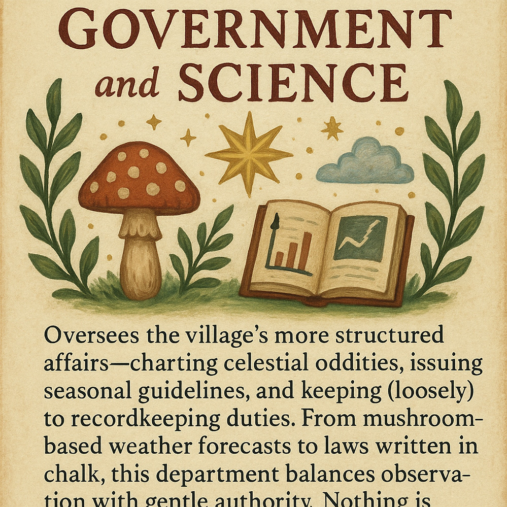 oversees the village’s more structured affairs-charting celestial oddities, issuing seasonal guidelines, and keeping (loosely) to recordkeeping duties. From mushroom-based weather forecasts to laws written in chalk, this department balances observation with gentle authority. Nothing is enforced, but everything is noted.