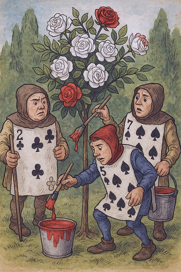A whimsical prelude to the Queen’s croquet party--mischief, mistaken tulip bulbs, painted roses, and royal uproar. In an enchanted glade, garden boys, cooks, and Alice herself become tangled in a riot of colour and confusion. A playful twist on Wonderland tradition by Marie Lynam Fitzpatrick.